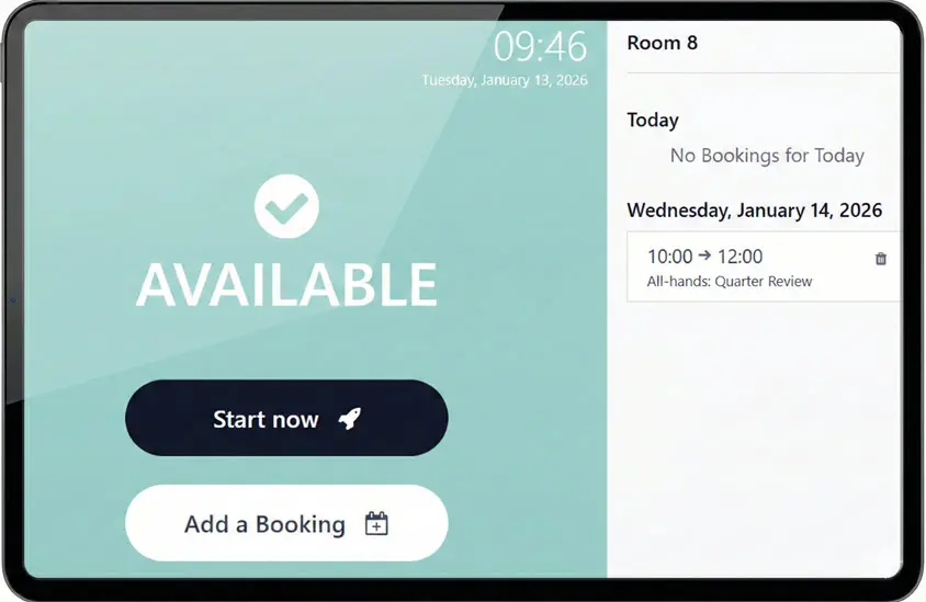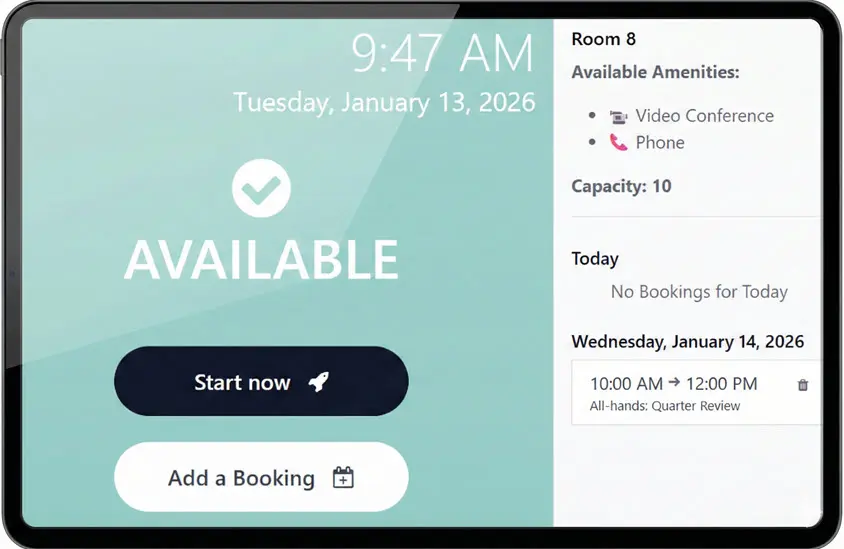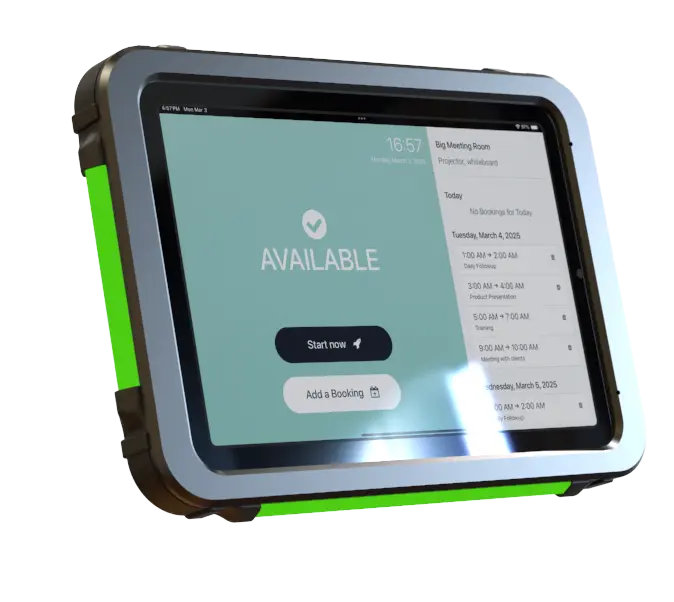 Give your employees the freedom to book conference rooms from Outlook, Odoo, or the room display tablet.