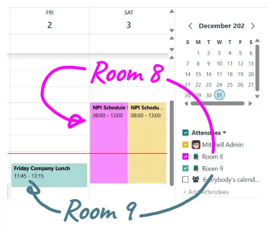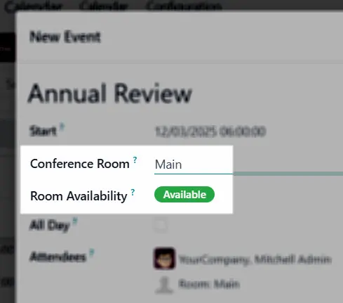 Easily check all conference room availability from the convenience of Odoo. By either looking at the Rooms App or from the calendar view.